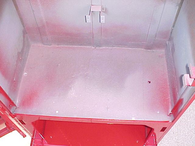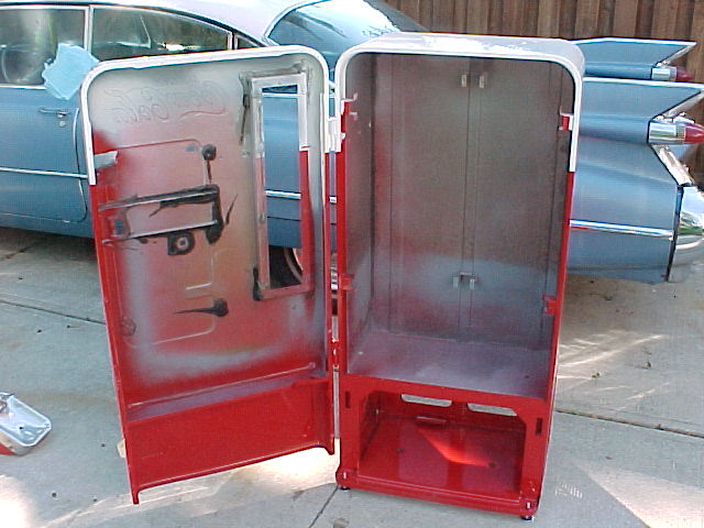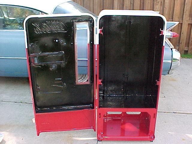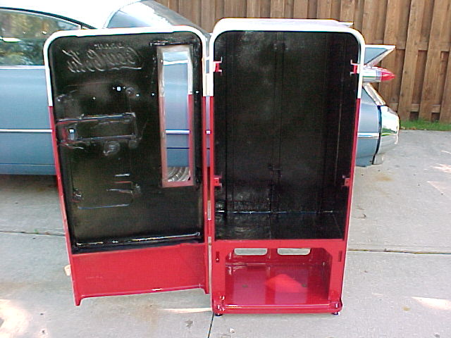 Once we receive a restored cabinet back from the Professional Paint shop, we install new leg levelers, and undercoat the interior of the machine's cabinet, before new insulation is installed..... Notice the replaced / repaired bottom cabinet piece..... This is simply an extra step, we like to do to protect the machines we restore. This will make the restoration last for years and years, provides a quieter machine, and helps hold the internal cooling temp..... such an easy step, too bad no one else does this.