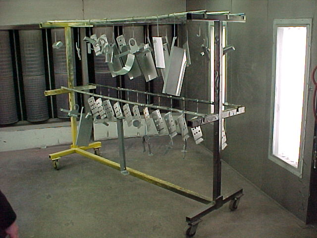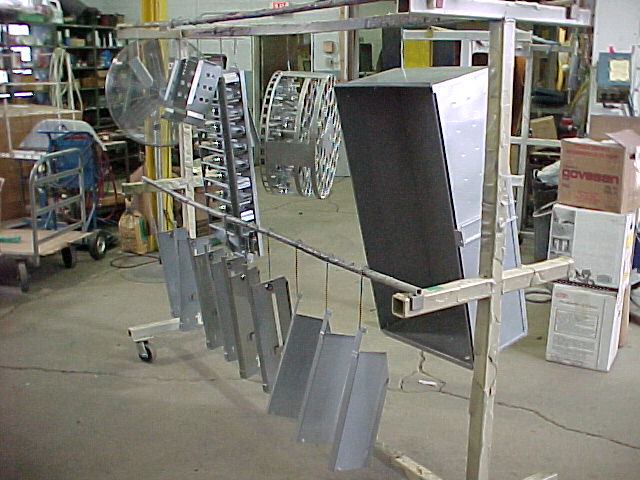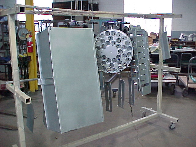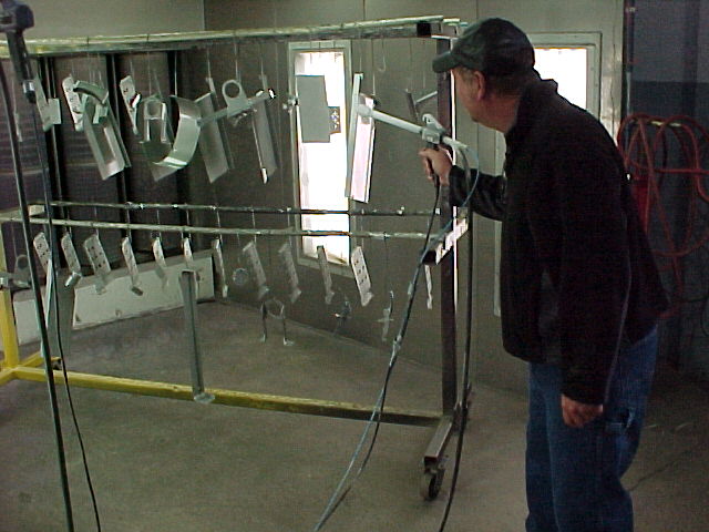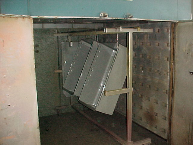 We use a professional Powder Coating Business to do all our powder coating. First the original old galvanizing is removed, the parts are media blasted, then they are cleaned, and each one individually hung and powdercoated, they are then baked in their ovens, and inspected for flaws. Notice that even the back sides of our inner cabinet liners are coated, and I believe we are the only ones who have figured out how to powder coat the entire Cavalier vending stack assemblies....