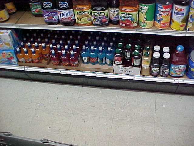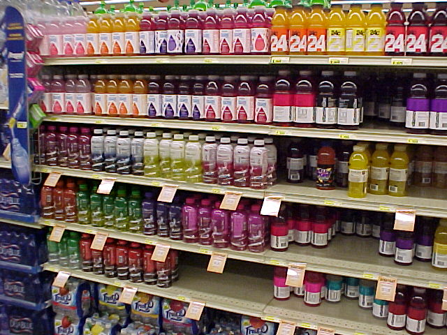 PLASTIC BOTTLED BEVERAGES: GATERAID, BOTTLED WATER, BOTTLED JUICES, KIDS JUICE BOTTLES, GREEN TEAS, LEMONED TEAS. MINERAL WATERS, PROPEL, ENERGY DRINKS.... ETC.